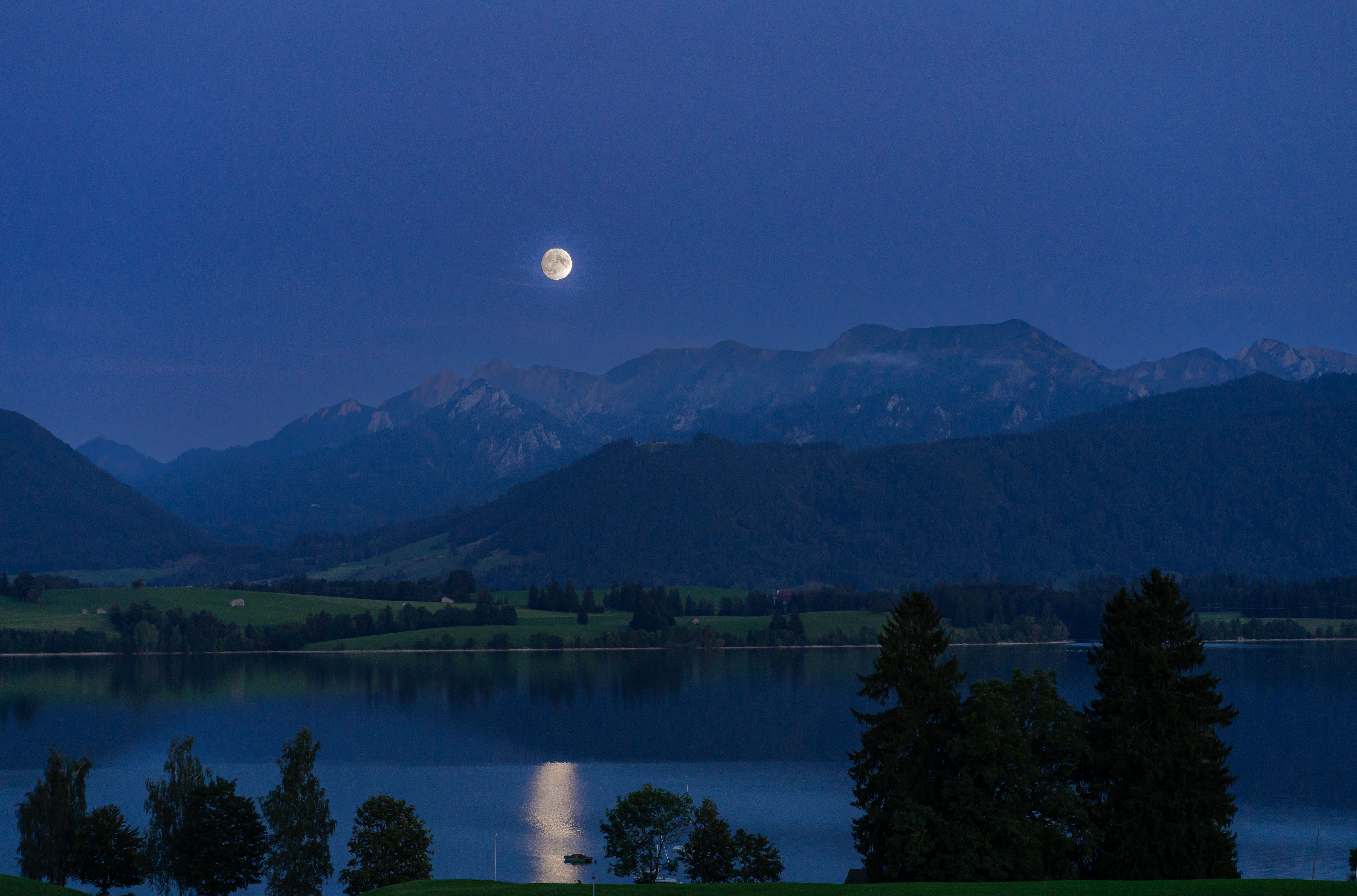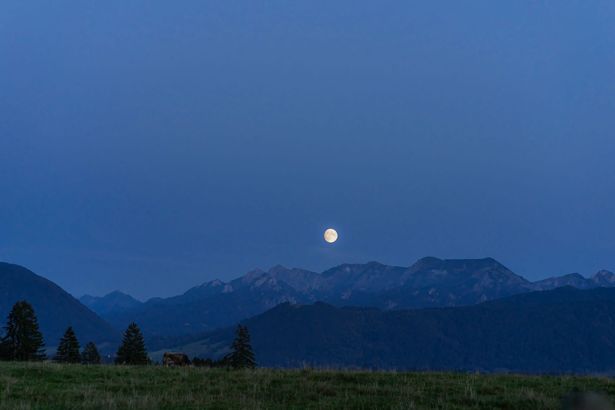 A few years ago, I was on a little vacation in the alps. On the drive back home after a long hike around a beautiful lake, I found myself exhausted, hungry and a little wet from the dog who, of course, had to go for a swim. I followed a winding road along lush meadows and cows happily munching on the grass in the approaching twilight. Suddenly, I saw this incredible view of the near mountains with the almost full moon rising above it. Believe me when I tell you that I gasped in delight so loud, I almost drove off the road. With 7% battery, no tripod and only a 35mm lens in my pack, I climbed out of the car and crossed the street. There, I found half a dozen other people gathering on the edge of a field admiring the view and taking photos with their phones. I took some photos that turned out alright, (thanks to my trusty Sony which honestly can do no wrong) and then stood there with the other folks in complete awe. The moon's reflection in the lake and the tiny little boats on the bank looked almost surreal, like a painting. Still, in the back of my mind I had this nagging voice that told me to try again and do better. The view is so beautiful, surely there is a way to capture it in absolute perfection? Maybe I can come back here tomorrow?